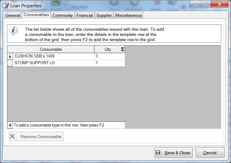 A new feature has been added from version 3.30 which allows consumables to be issued with loans. For example, a wheelchair may be loaned to a patient and while the wheelchair itself is listed in the e-Quip inventory, things like cushions, stump supports etc may not be. In the past it would have been necessary to record these as free-text notes within the loan but this is far from ideal.