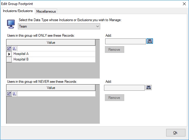 The Footprint Manager takes discriminators and says “you can only see …” (an inclusion) or “you can never see …” (an exclusion). If you use a footprint to say “members of this group will only see data where the Team = Hospital A“, then this applies across all screens and also applies to lookups. These users will only see equipment, jobs, contracts etc., which have been assigned to the team “Hospital A“.